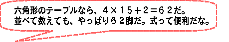 「テーブルの数を□、いすの数を△とし、2つの関係を式に表してみよう。」 |